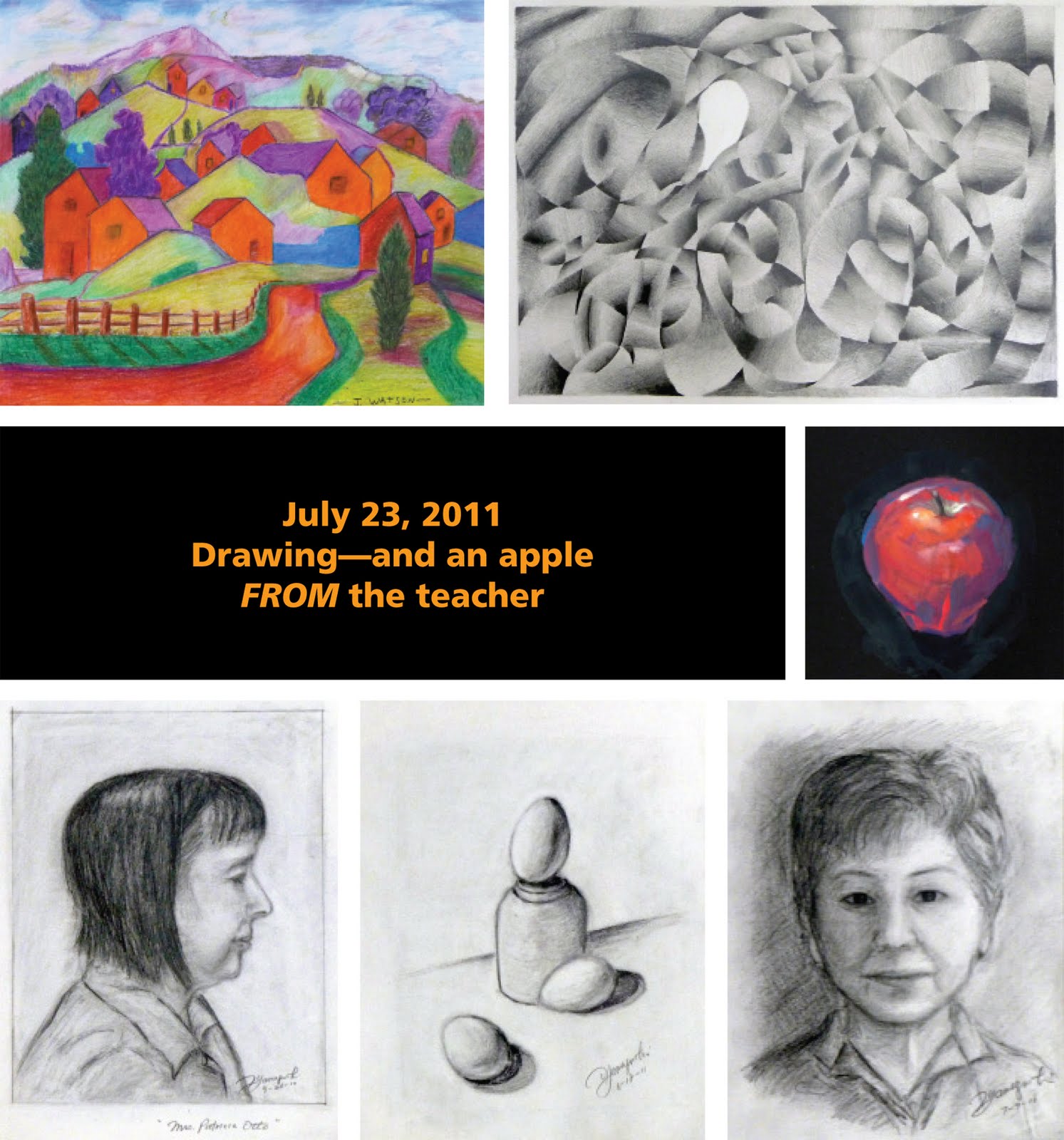 Our paintings feature a range of colorful landscapes—from stormy cityscapes to lush desert islands, with a stop for morning coffee in between. Throw in some rich color studies (and color swatch kitties) and you're in our world of color. Check out the studies in grey too. Every grey uses a different combination of color. They're all grey, but very subtly colorful. Even our drawings crossed the line into painting—colorful brush portraits in india ink. And of course, it's the end of the term, so we got a painted grade from the teacher. (We're assuming she means our art is "peachy" and not "the pits!")