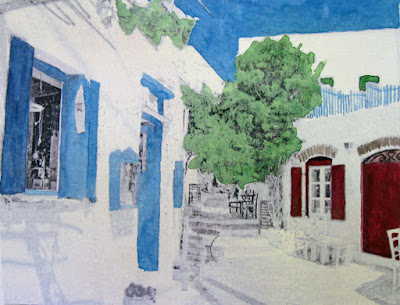 Steve's also doing a figure against a richly textured background. And he's also used Blending Medium. Like Ellen, he's amazed by how long it extends the drying time. This week, he's begun the water, using saran wrap to add texture.