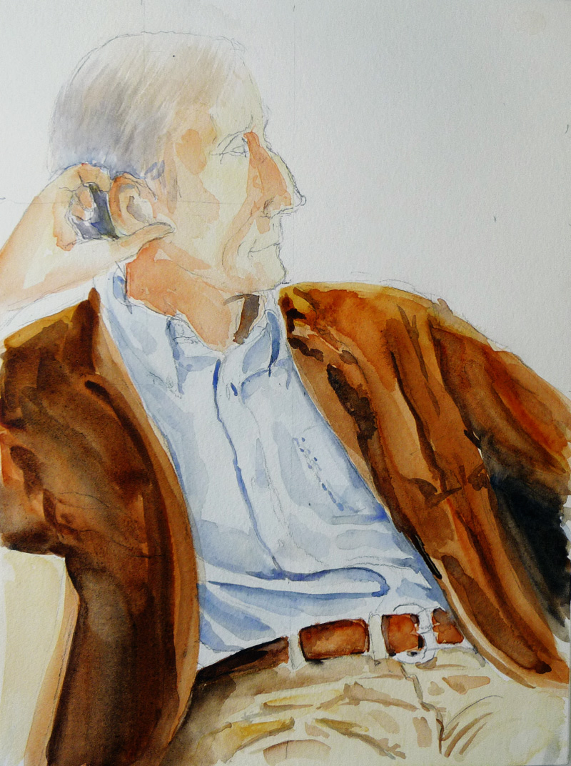 We're still into portraits, as you can see from Elaine's painting below. Like Greeta, she's saved the hard parts (the facial features) for last. Tune in next week to see how the man in the corduroy jacket turns out.