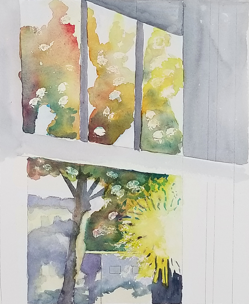 Sara also began another version of her view from her window. She's basically using two triads (a triad is a set of three colors, and she's using two reds, two yellows and two blues) to describe all the colorful autumnal glory of the trees outside her window. We really like the composition—the angles add energy and draw the viewer's eye to the colors outside.